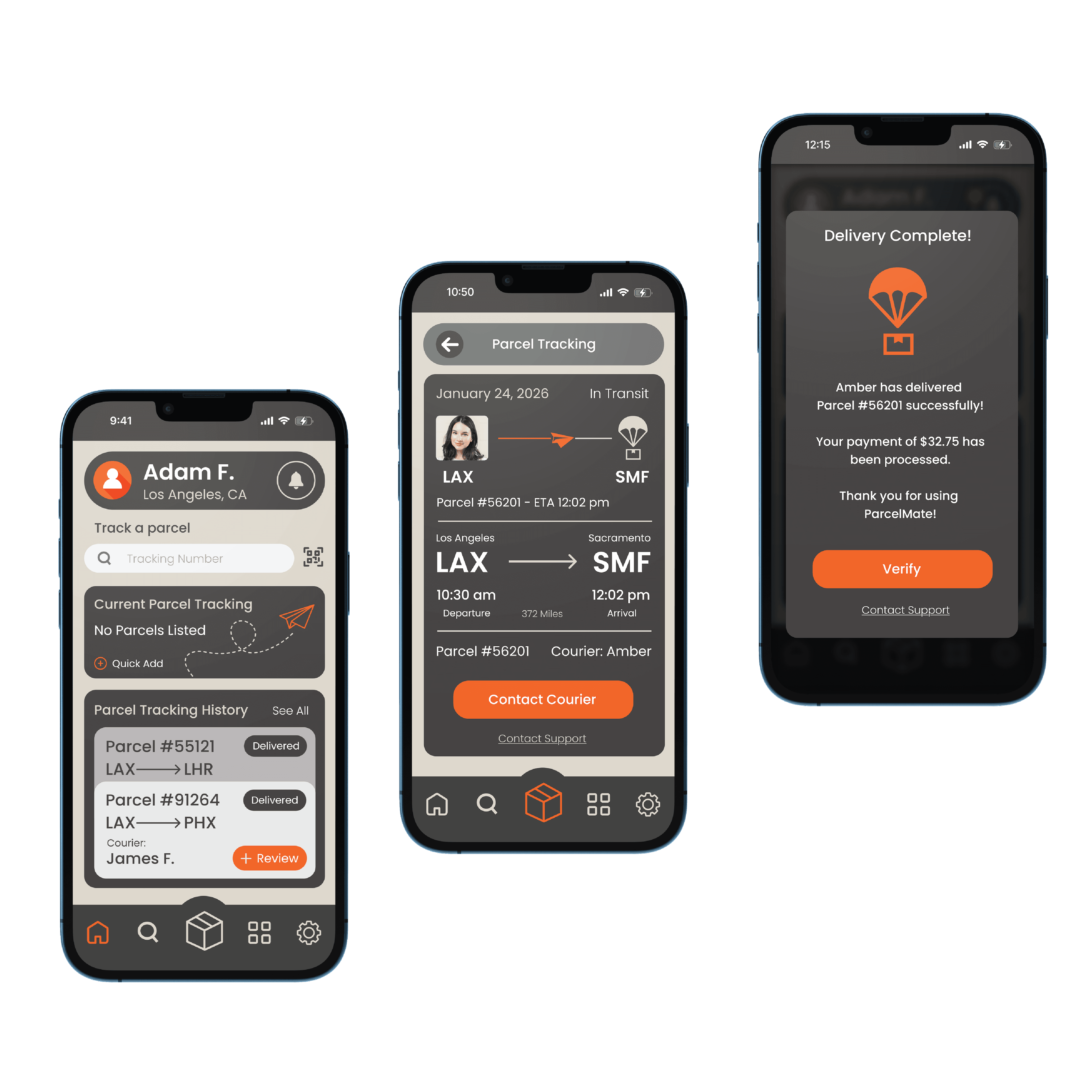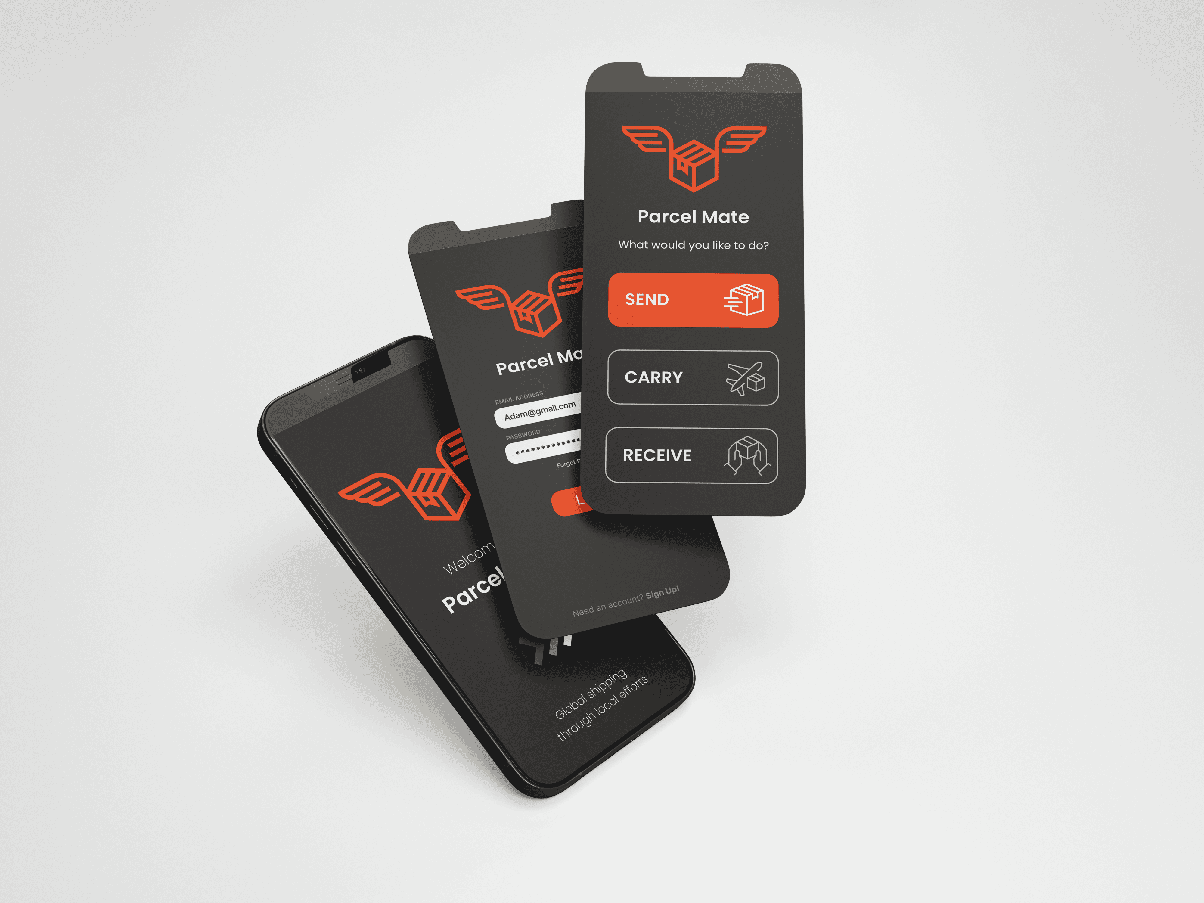 Parcel Mate is a platform that connects flight passengers with users who need to send small packages to specific destinations, creating a faster and more direct delivery experience. My design focused on building a clear, user-friendly interface that makes parcel tracking intuitive and transparent. The app highlights real-time tracking, courier verification, and delivery confirmation, ensuring trust between sender, courier, and recipient. With bold icons, streamlined layouts, and a clean visual hierarchy, the design emphasizes reliability and ease of use while keeping the delivery process straightforward from start to finish. Developed as a class project, sponsored by Edenspiekermann.